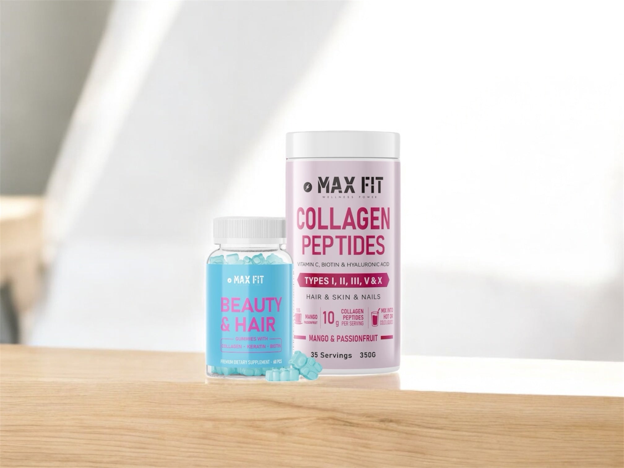 Multipeptidový kolagén s vitamínom C, kyselinou hyalurónovou a biotínom v exotickej príchuti mango & marakuja, a vlasové vitamínové gumíky s unikátnou synergickou zmesou 14 vitamínov: MSM, biotínu, bambusu, hydrolyzovaného kolagénu a keratínu.